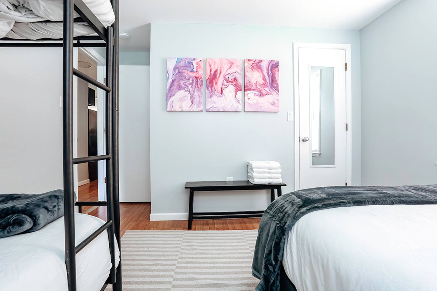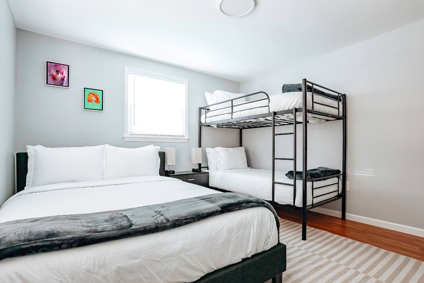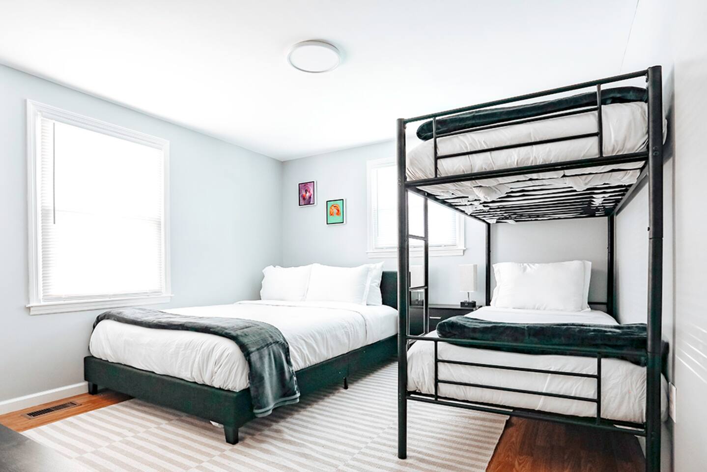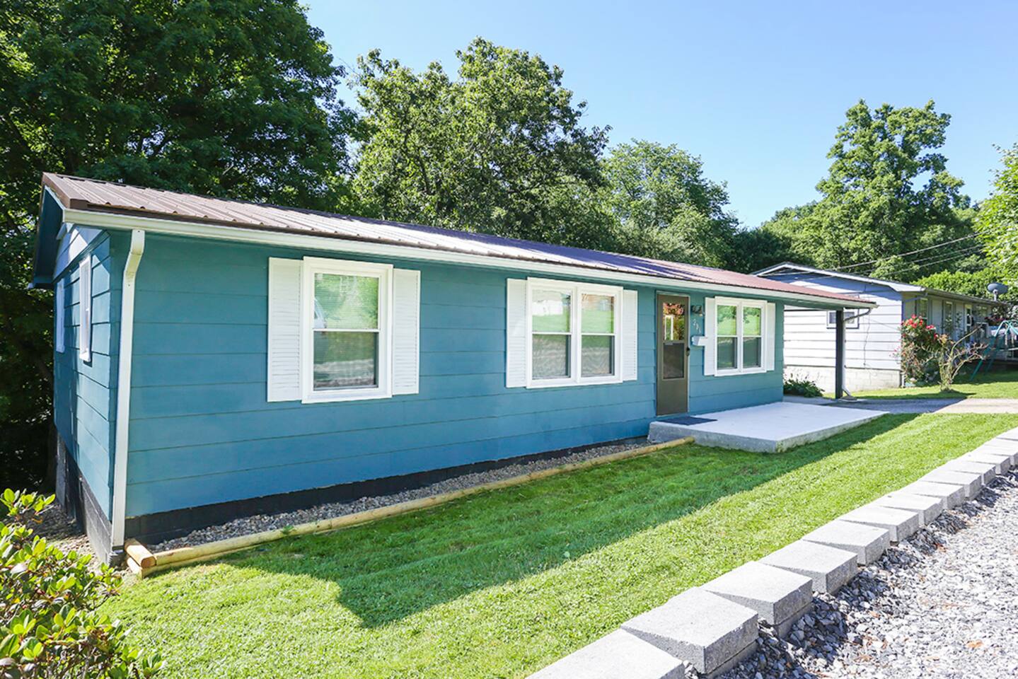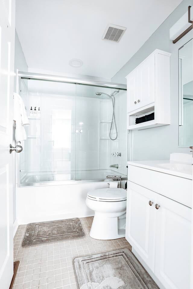 This space was fully renovated in Spring 2021, it is freshly remodeled and ready to host you. It offers a fully, equipped brand new kitchen with everything you need to craft a meal. Unwind in the evenings with a board game, or set up shop in front of the 65" smart tv with surround sound. This home is sure to please. The house is well-equipped with fresh towels, bed linens, hair dryer, refrigerator, microwave, stove, toaster oven, dishes, blender, coffee pot, utensils, pots, and pans. This property does not have a dishwasher. Bedroom 1 Queen bed Bedroom 2 Queen bed + bunk beds Bedroom 3 Queen bed Bathroom Tub/shower combination with glass shower doors